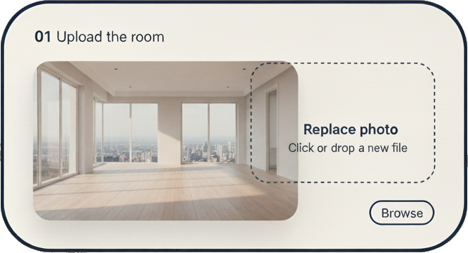 Drop in up to 30 raw photos. We automatically detect perspective, clutter, and lighting so the AI understands your space perfectly.