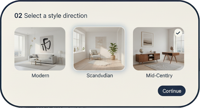 Our AI considers lighting, architecture, and perspective to create magazine-quality interiors that feel real.